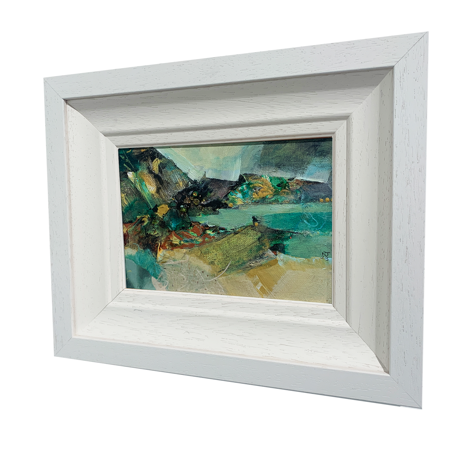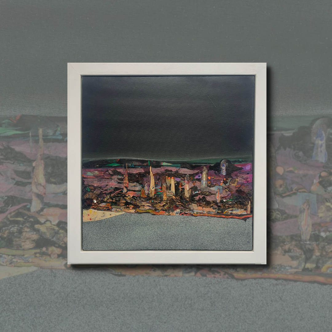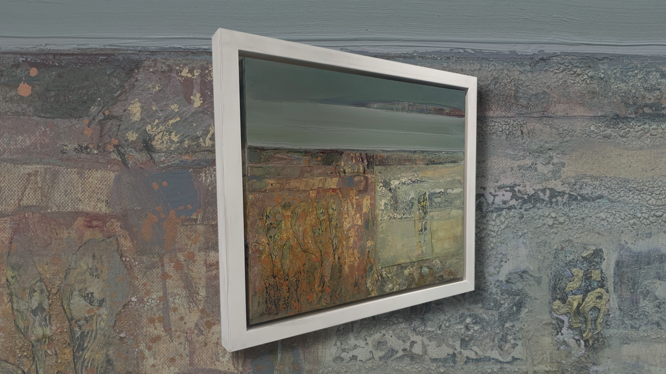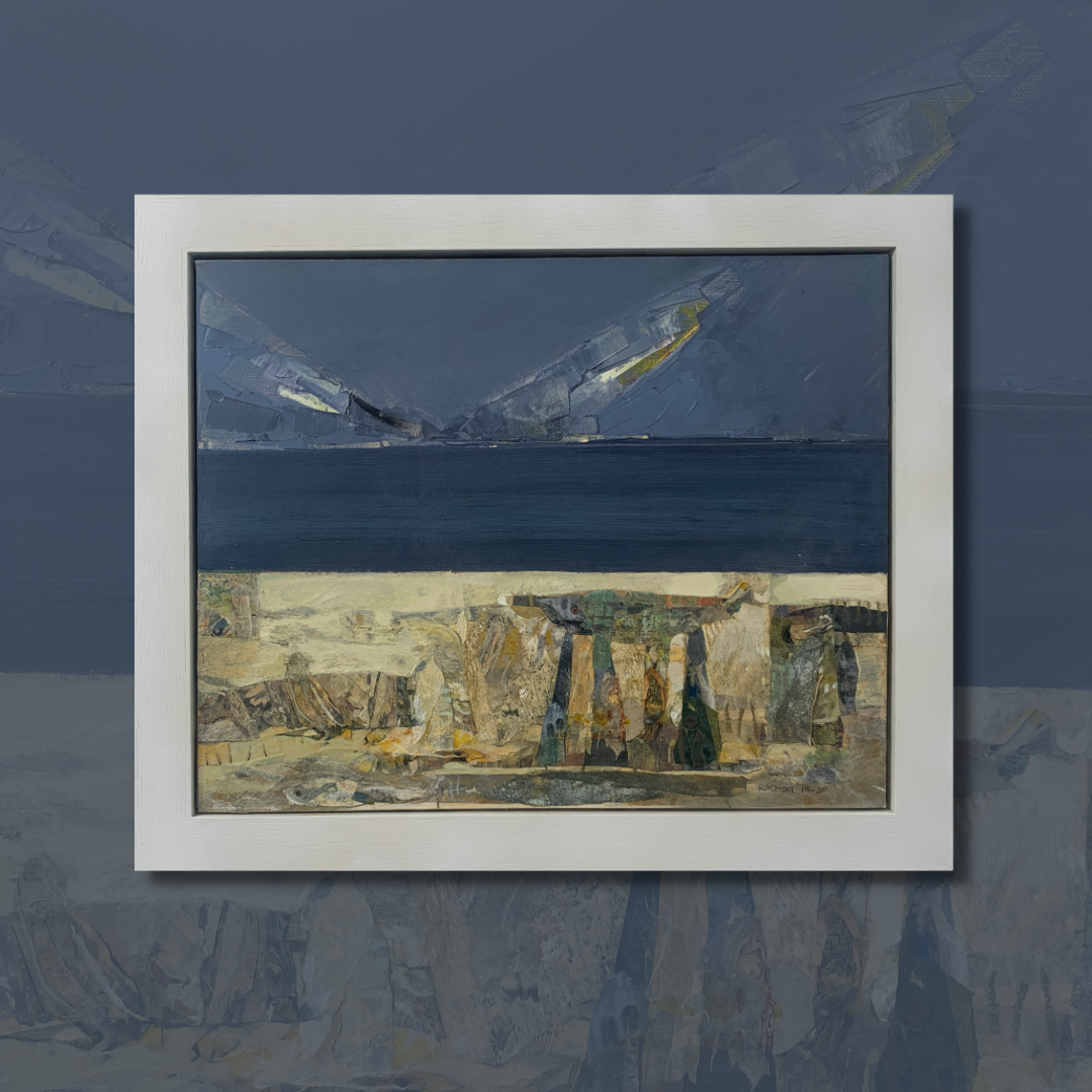 Rachael Johnson’s mixed media collage paintings on canvas evoke the bog and shore of Derry. The sweep of fractured scarp and tilted seam of fossiled stone, brackish fern and peat moss, soft rush sward and the slow seep of dank bog pools. Recalled from sensory memory these are inscapes.