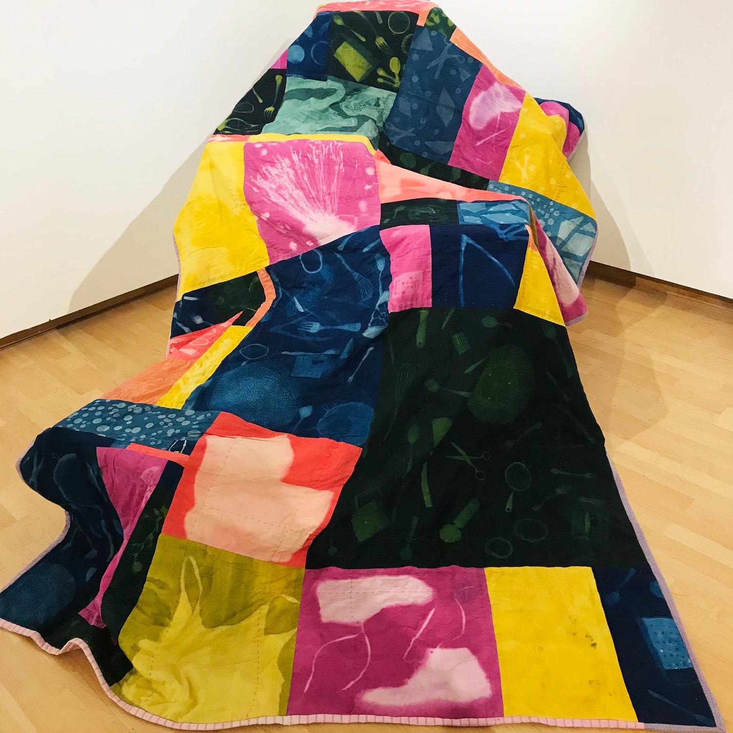 Cyanotype and Solarfast Dye on Cotton, Found Fabric, Denim, Thread